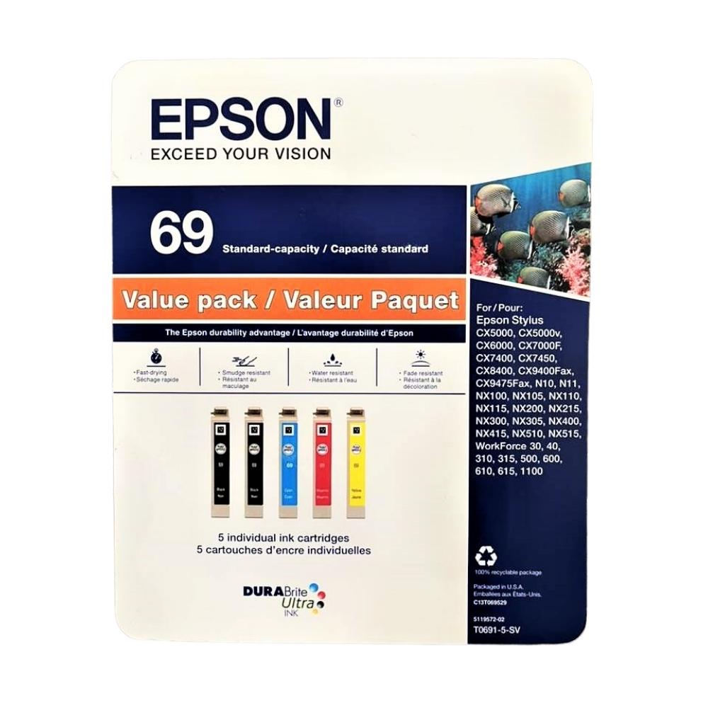 • Contenu : couleur : 2 noires, 1 cyan, 1 magenta, 1 jaune (5 cartouches d'encre compatibles 69 T069).
