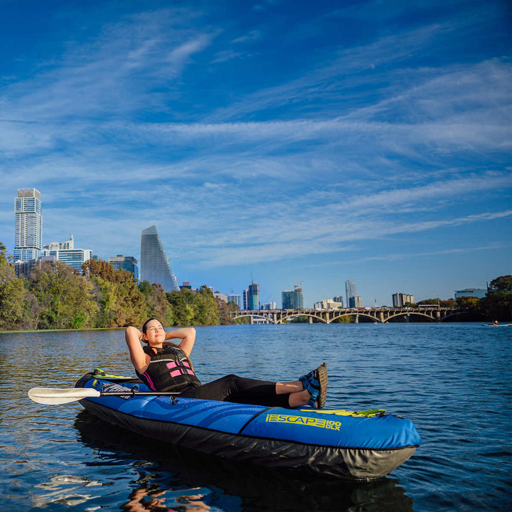 • Le iESCAPE 100 DLX de Pelican est un kayak gonflable parfait pour les eaux calmes.